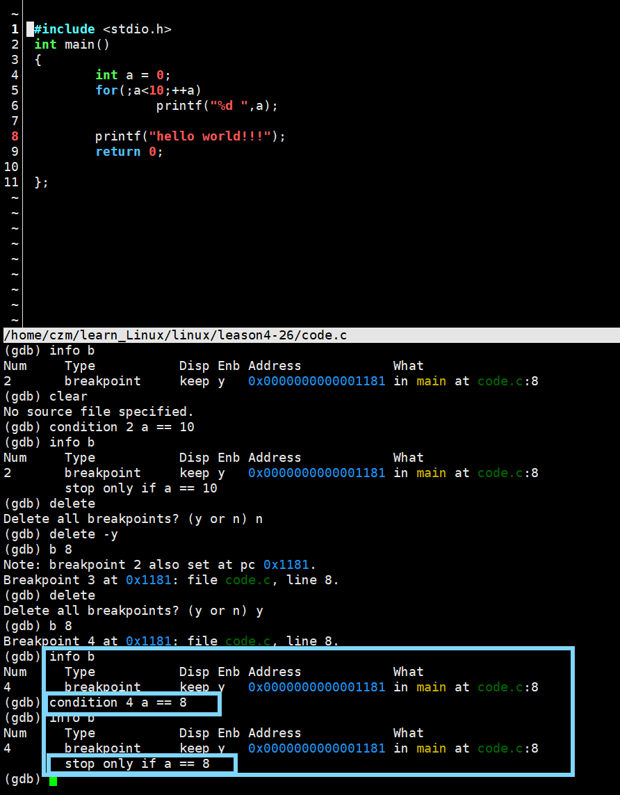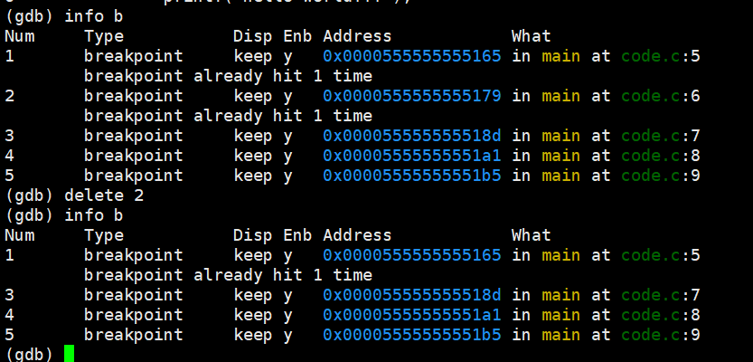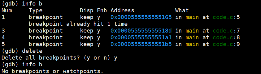 delete 不加编号,默认删除所有的断点;加入编号,就是删除指定断点。