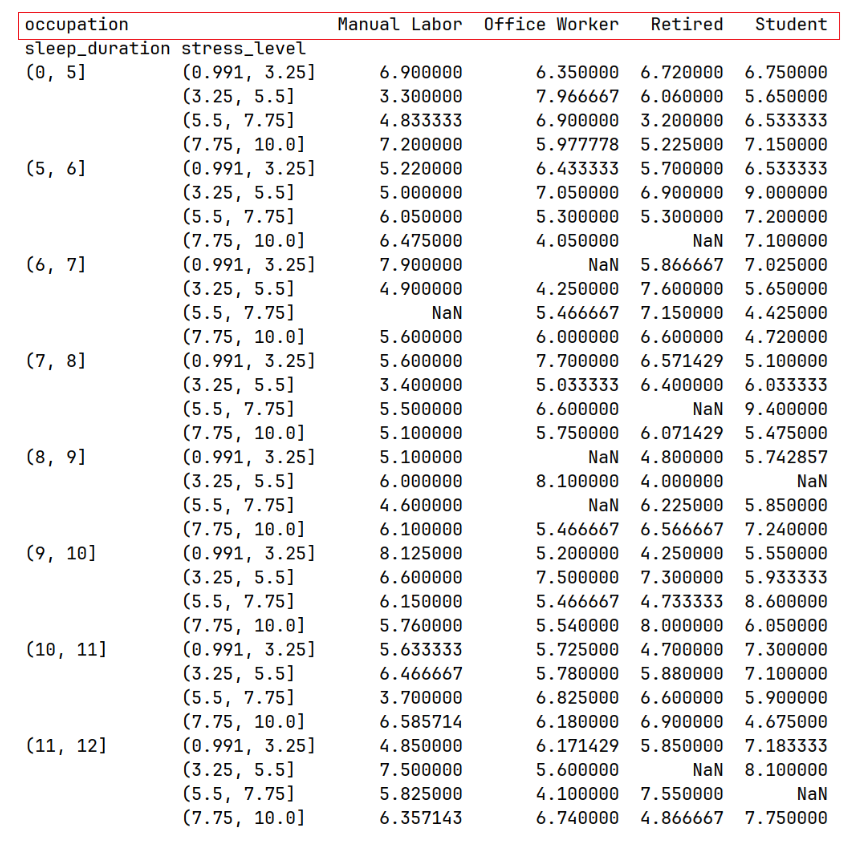 print(df.pivot_table(values="sleep_quality", index=[sleep_duration_stage, stress_level_stage], columns=["occupation"], aggfunc="mean"))