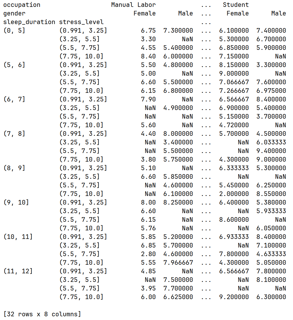 print(df.pivot_table(values="sleep_quality", index=[sleep_duration_stage, stress_level_stage], columns=["occupation", "gender"], aggfunc="mean"))