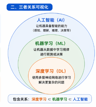 **人工智能(AI , Artificial Intelligence):**人工智能是让计算机模拟人类智能的科学与工程,使机器能完成通常需要人类智能才能完成的任务。他是一个广泛的领域,目标是让机器具备"感知、理解、推理、学习、决策"等能力。