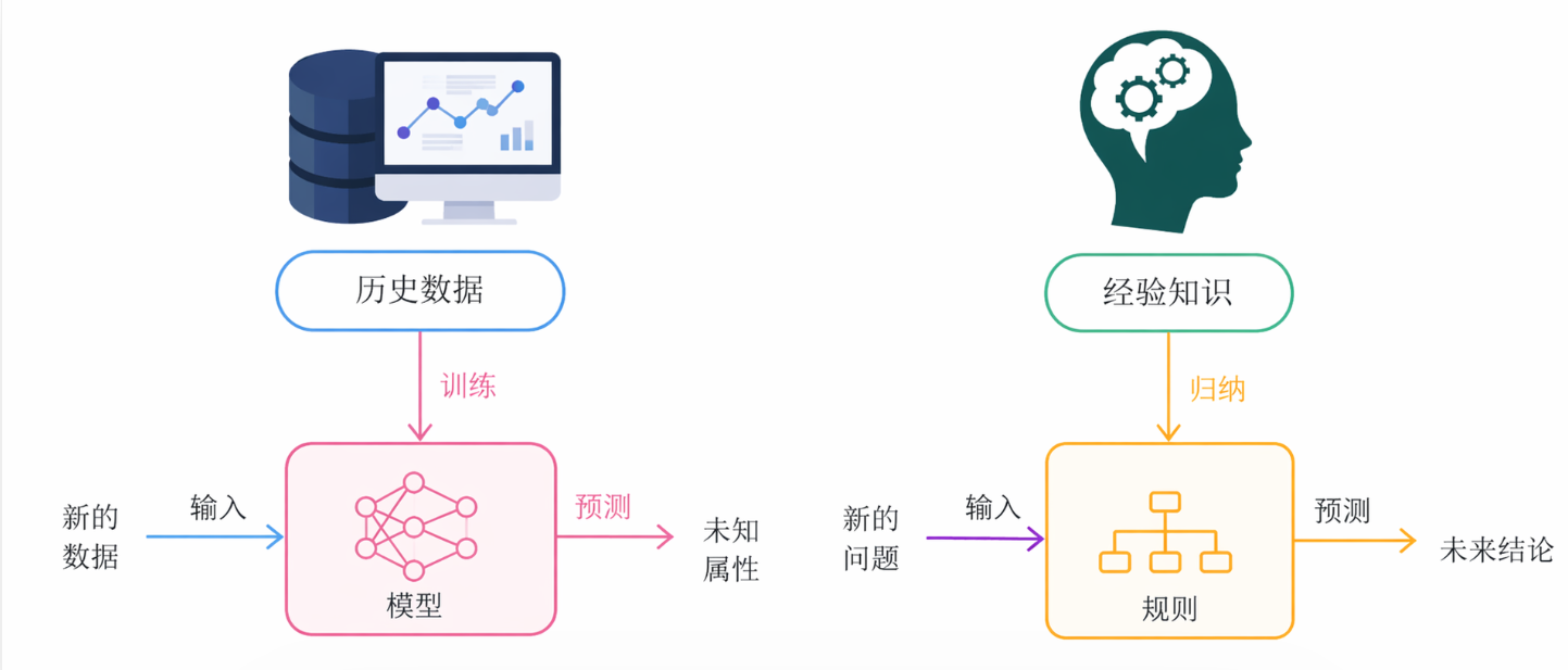 **定义:**不依赖于硬编码的固定队则,而是让计算机利用数据自行"学习"出规律和模式。