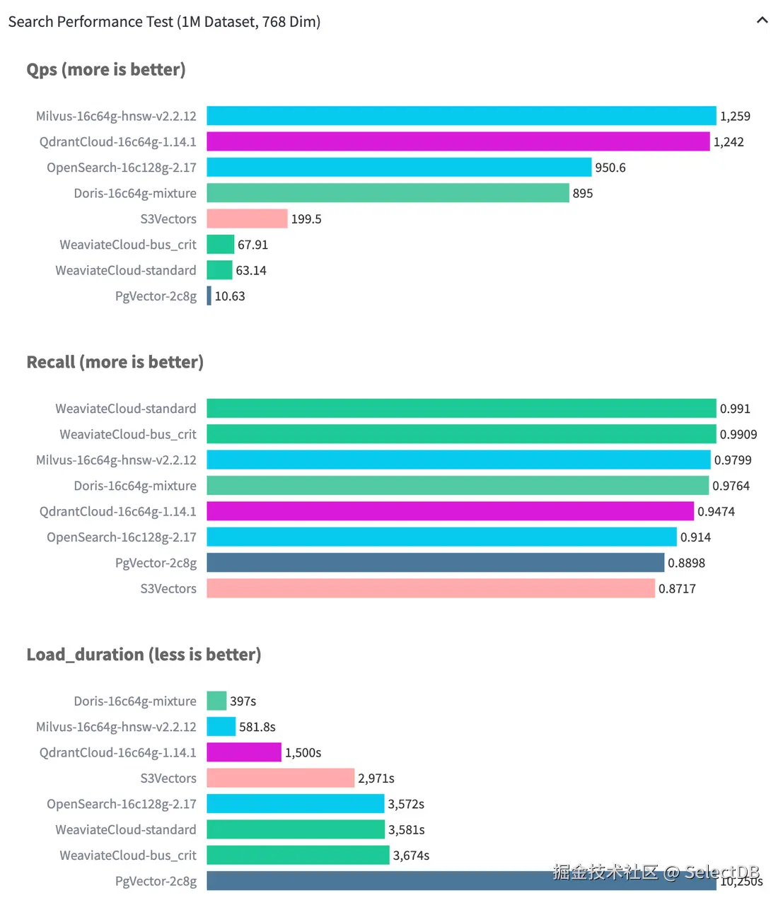 根据 VectorDBBench 公布的数据(截至 2026 年 1 月),Doris 在索引构建速度上优于 Milvus、Qdrant、pgvector 等系统,这一优势主要得益于其数据分层架构。