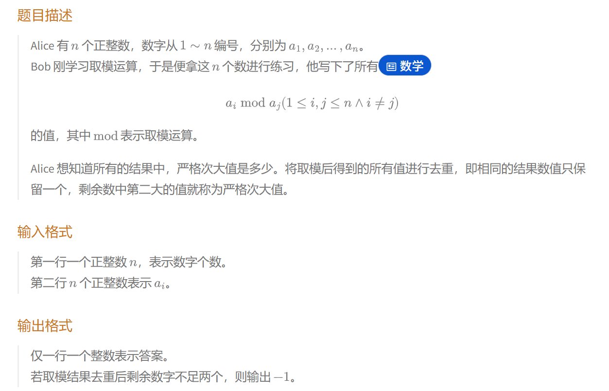 CSP-J 2019江西省真题- 次大值,主要考察排序算法与取模运算的数学性质,重点在于对不同数据的分情况讨论与逻辑推导分析,适合GESP四、五级及以上考生练习,难度⭐⭐⭐,洛谷难度等级普及/提高-。