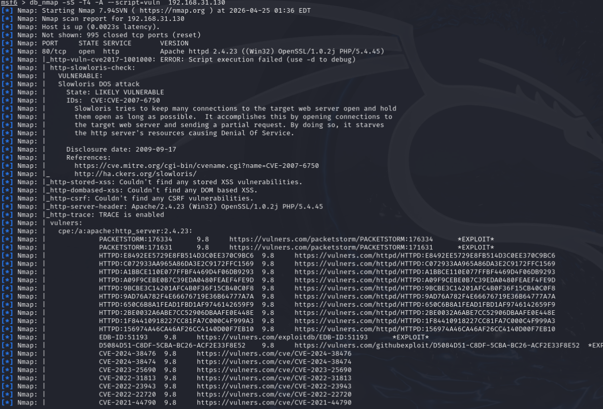 db_nmap -sS -T4 -A --script=vuln 192.168.31.130