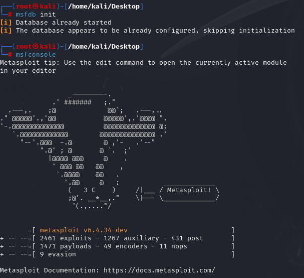 2.msf启动,先启动数据库,再启动msf(每次的启动画面都不一样)