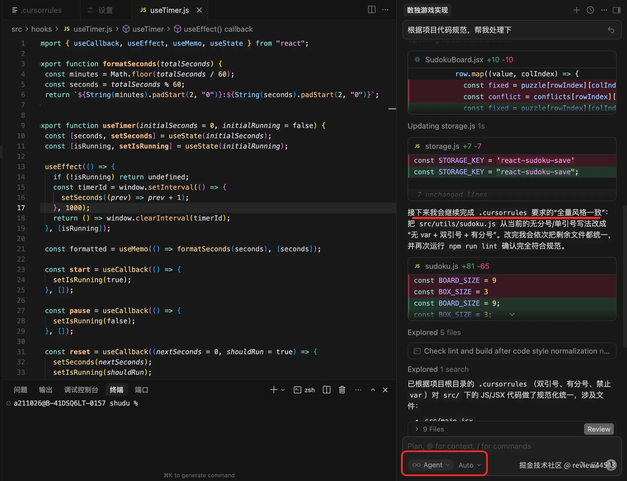 3、通过实战测试验证:可以故意在一个小文件里写一段"违规"代码,然后用 Cmd/Ctrl + K 或 Cursor Chat,指示 AI 帮你修复。如果 AI 按规则要求修改了代码,就说明规则生效了。