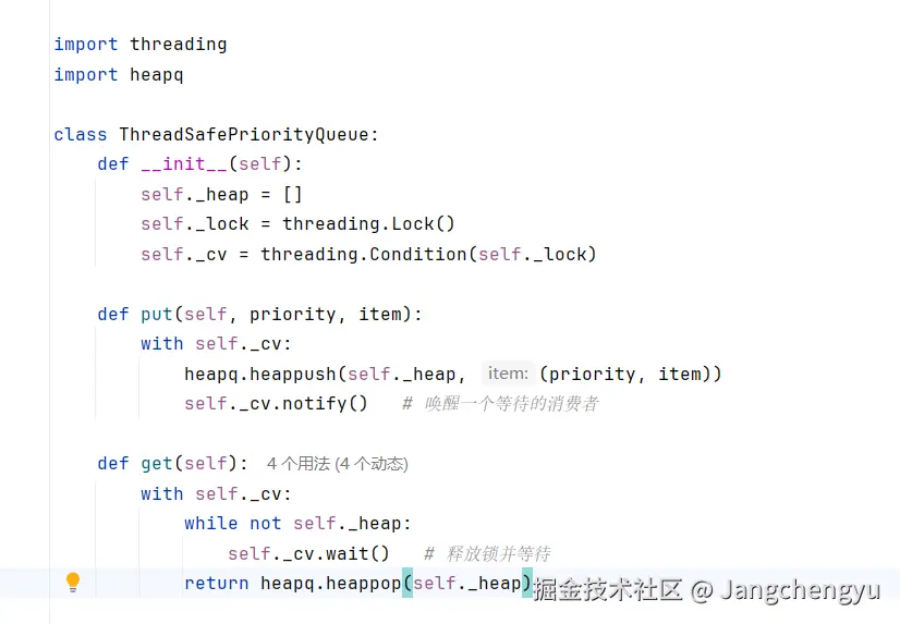 heapq模块 :提供堆队列算法,heappush和heappop保证最小的 priority 在堆顶。self._lock:基础锁,但这里不直接使用,而是交给Condition管理。Condition(self._lock):条件变量,内部封装了锁。with self._cv相当于先获得锁,代码块结束后释放锁。wait():释放锁并将线程挂起,直到被notify()唤醒。被唤醒后,线程会重新获取锁并继续。notify():唤醒一个正在wait()的线程(如果有多个,只唤醒一个)。while not self._heap:防止"虚假唤醒"。即使被唤醒,也要再次检查队列是否真的非空。
