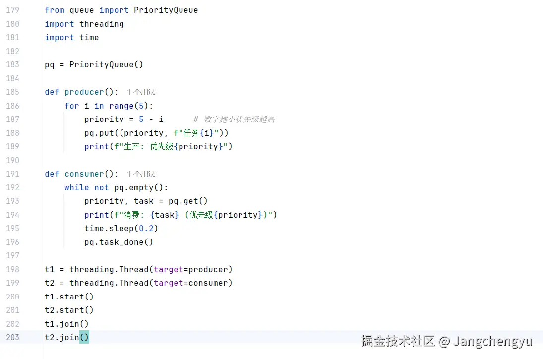 (priority, data),priority 越小越先出队。如果 priority 相同,则按插入顺序(先进先出)。 task_done():告诉队列一个任务已完成,配合queue.join()可以等待所有任务完成。- 阻塞行为 :如果队列为空,