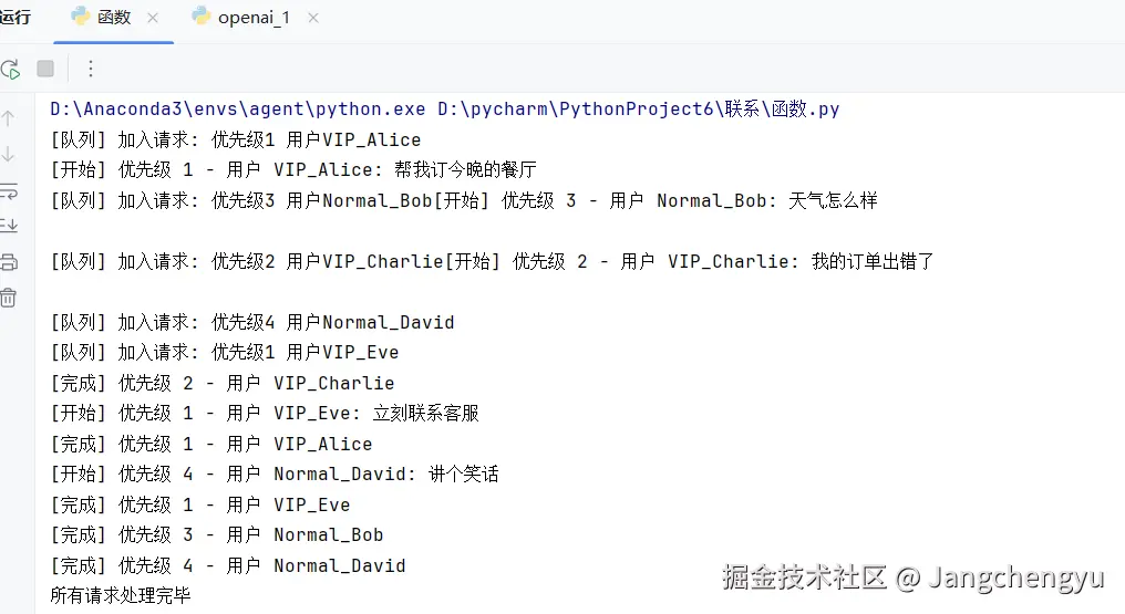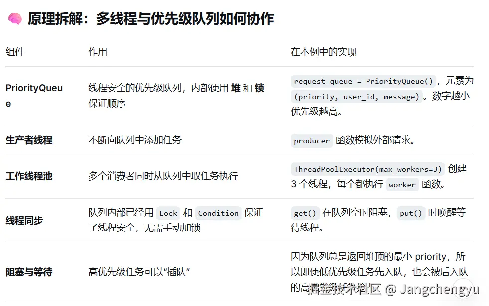 在真实的 AI Agent 系统中,常常需要同时处理来自多个用户的请求,并且某些请求(比如 VIP 用户的指令、紧急的系统任务)应该优先 执行。这时候,多线程 负责并发执行任务,优先级队列 负责给任务排序,两者结合就能构建一个高效且灵活的 Agent 调度器。下面我们设计一个客服 AI Agent 的简化模型: