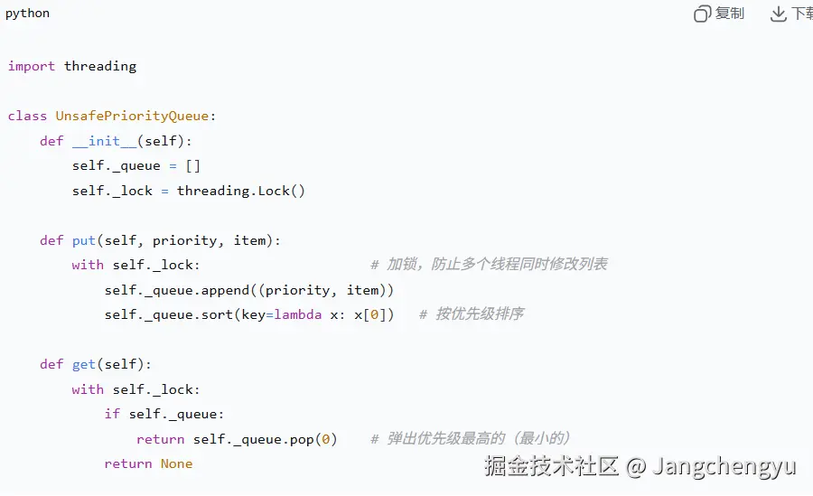 PS:优先级队列的核心要素在数据结构、线程安全、阻塞/通知机制,通常用堆(heapq)或列表排序实现优先级;依赖Lock或Condition保护共享数据;用Condition或Queue内置的阻塞实现生产-消费协调。