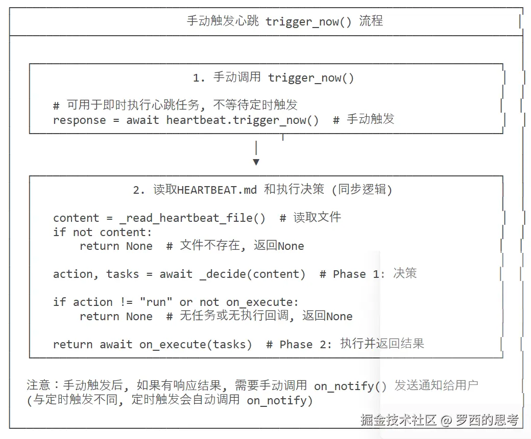 支持手动触发心跳检测,兼顾 "自动周期性执行" 和 "手动应急触发" 需求。