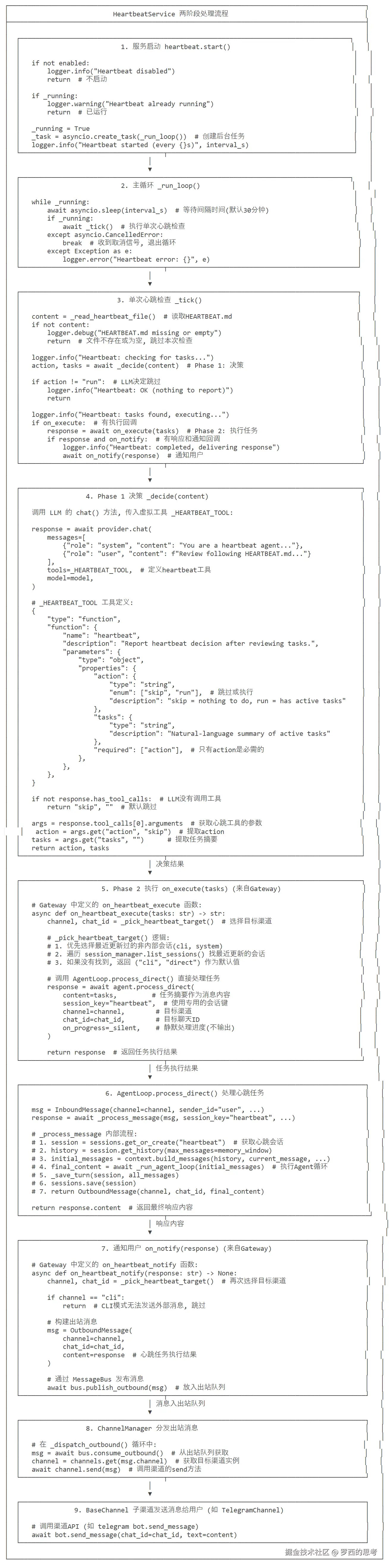 HeartbeatService是 Nanobot 的周期性任务检测与执行服务,其放弃传统的 "硬编码规则解析",改用 LLM 驱动的智能决策,适配自然语言描述的任务场景;基于 asyncio 实现轻量化的周期性调度,无需依赖 Celery 等重型定时任务框架。