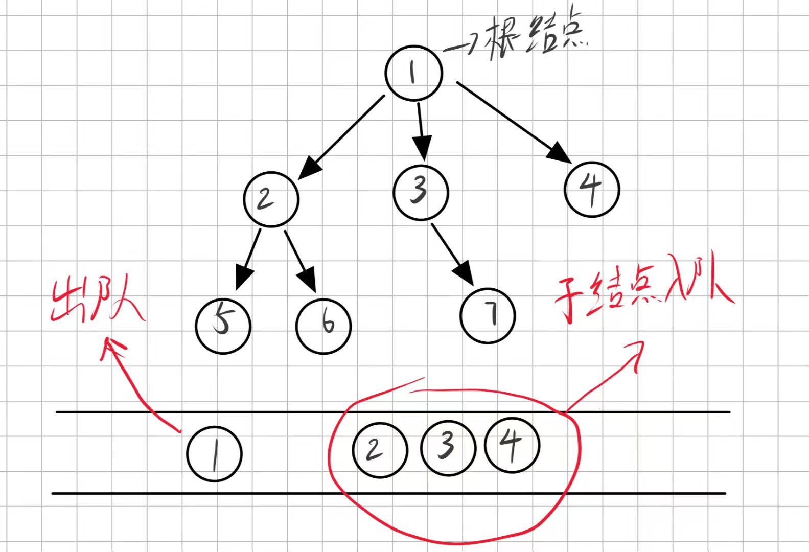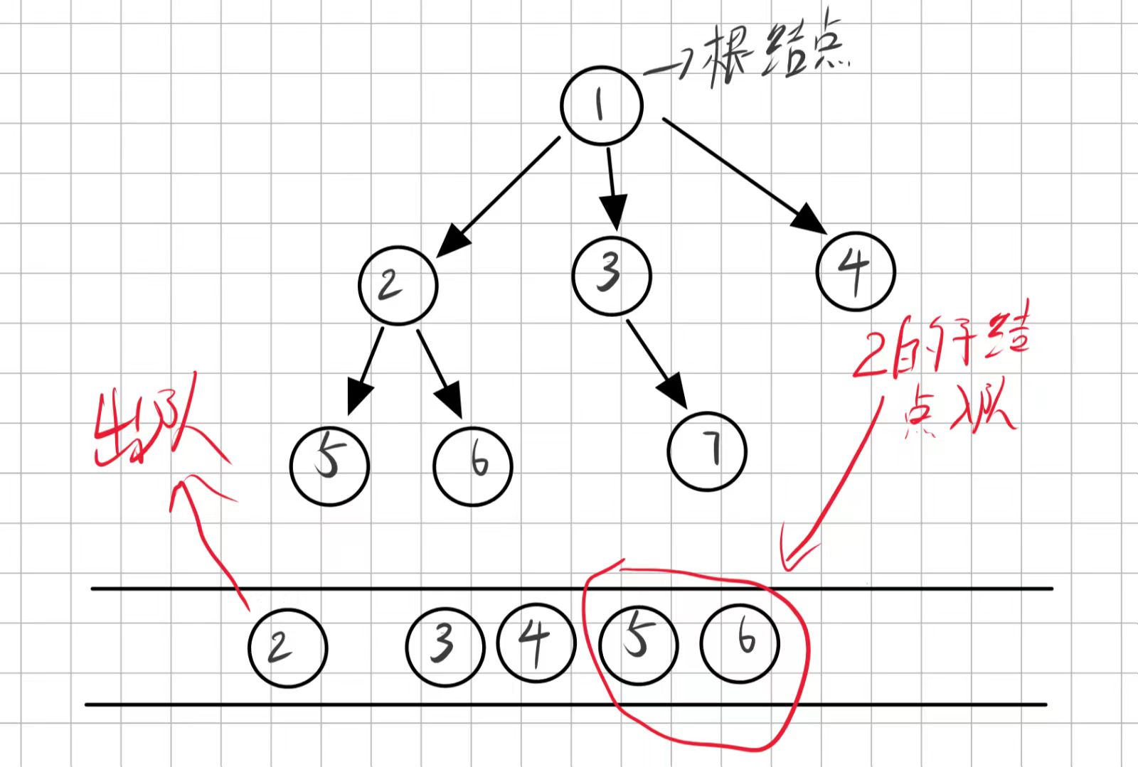 接着再让第一个子结点出队让2的子结点进来: