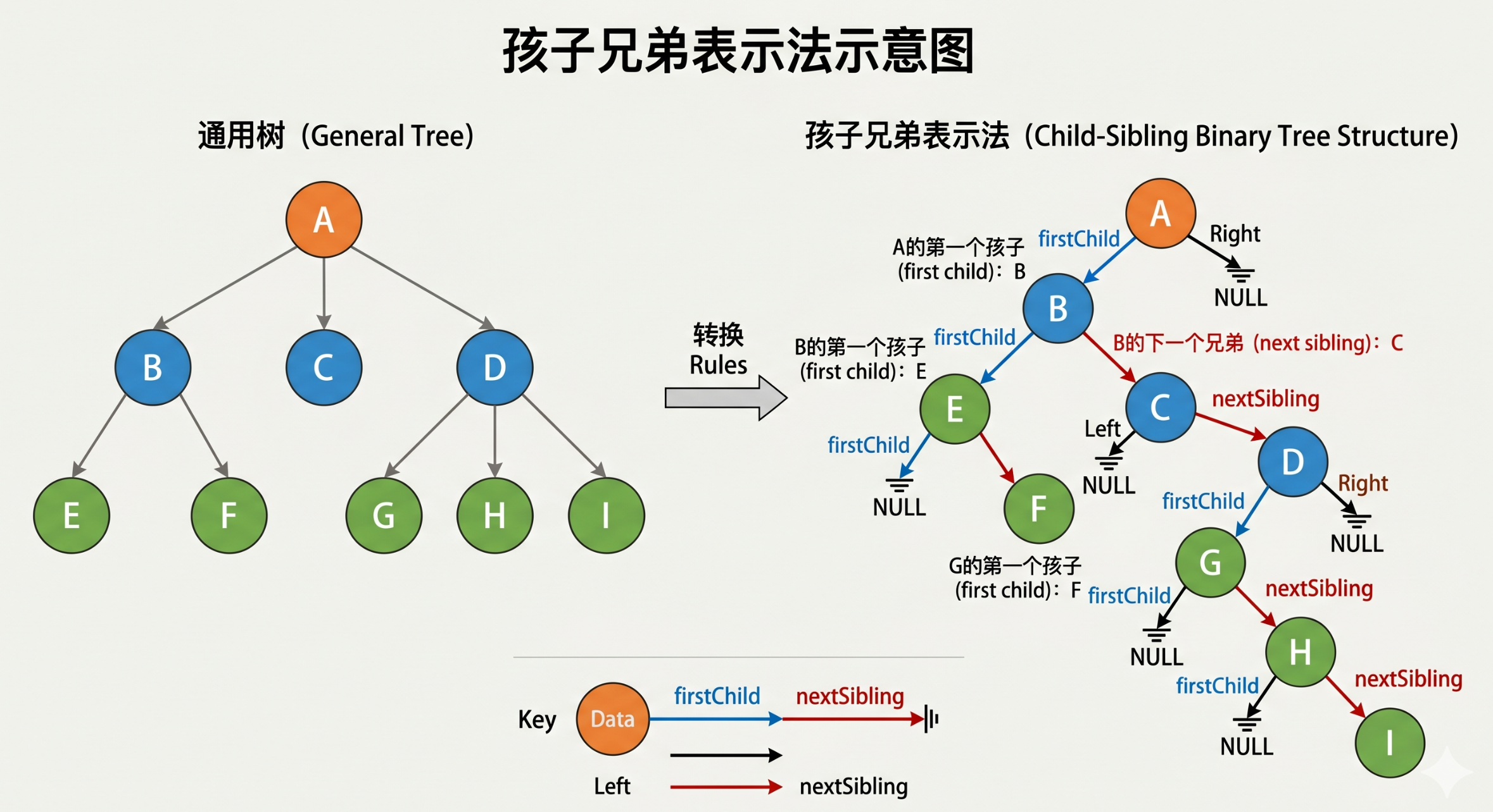 孩子兄弟表示法又被称为左孩子右兄弟表示法,这个方法可以将一个普通的树以二叉树的方式来进行存储,在这个表示法中我们需要维护两个指针