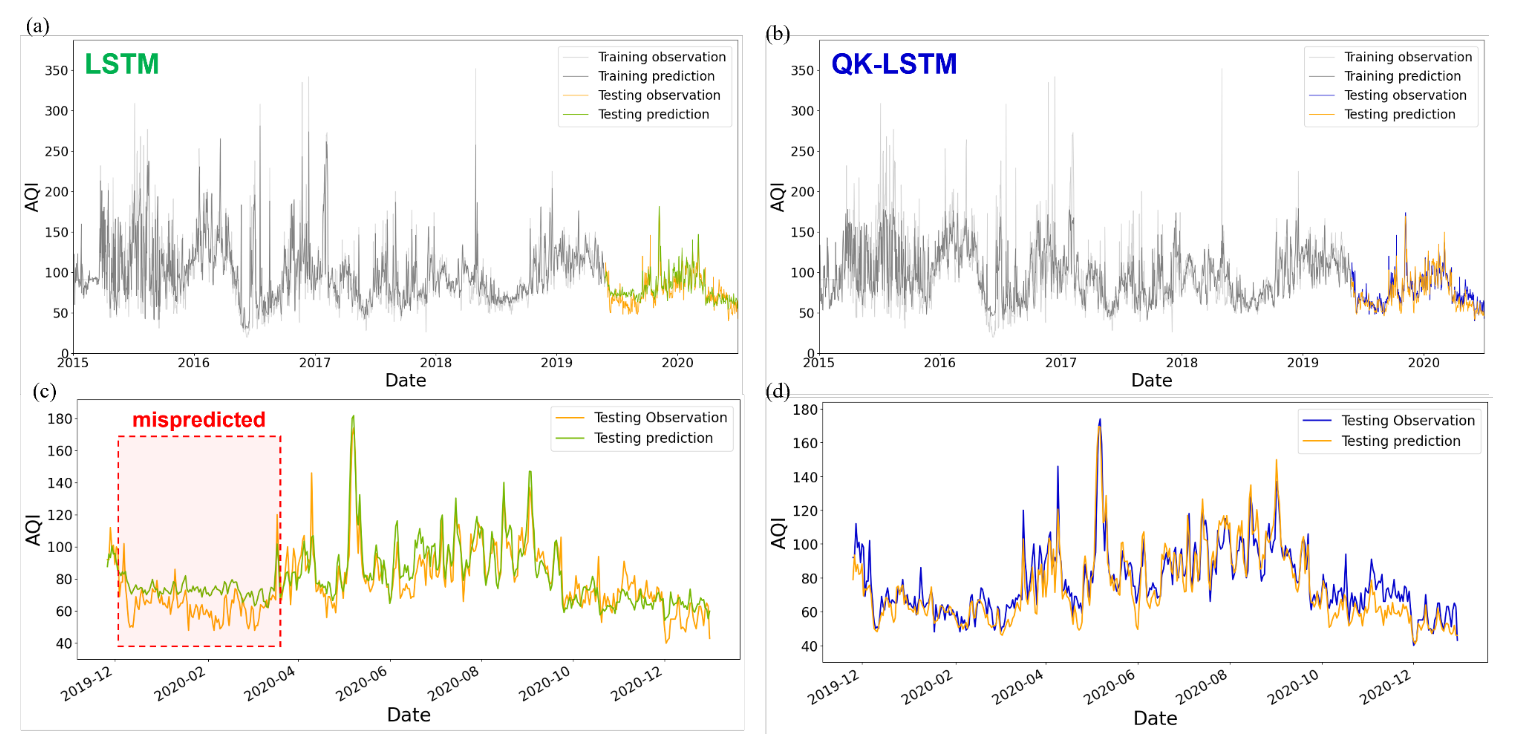在模型效果上,对比经典 LSTM,QK-LSTM 三项核心误差指标均大幅降低,其中 RMSE 从 15.94 降至 9.2,MAE 从 11.07 降至 7.15,MAPE 从 13.32% 降至 9.14%。除此之外, 也从 0.78 提升至 0.84。同时,从下面论文的预测曲线图(如下)来看,QK-LSTM 的预测曲线与真实值的拟合度更高,尤其是在 AQI 出现剧烈波动的尖峰和低谷处,这表明它对时序数据的动态变化更敏感。