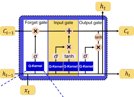 在量子核嵌入方面,如核心思想所讲,用量子核映射替代 LSTM 门控机制中的线性变换,具体如下示意图: