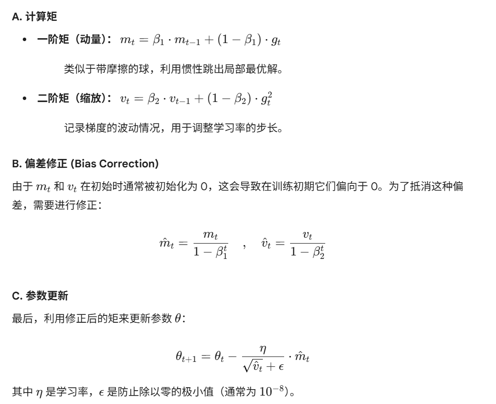 Adam的核心在于维护两个变量:一阶矩(梯度的均值)和二阶矩(梯度的未中心化方差)。假设