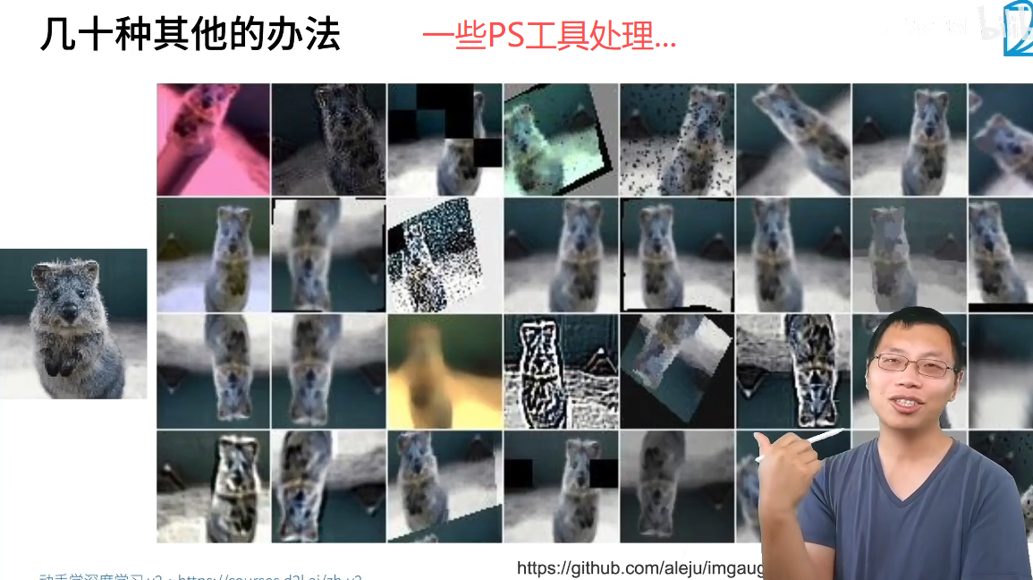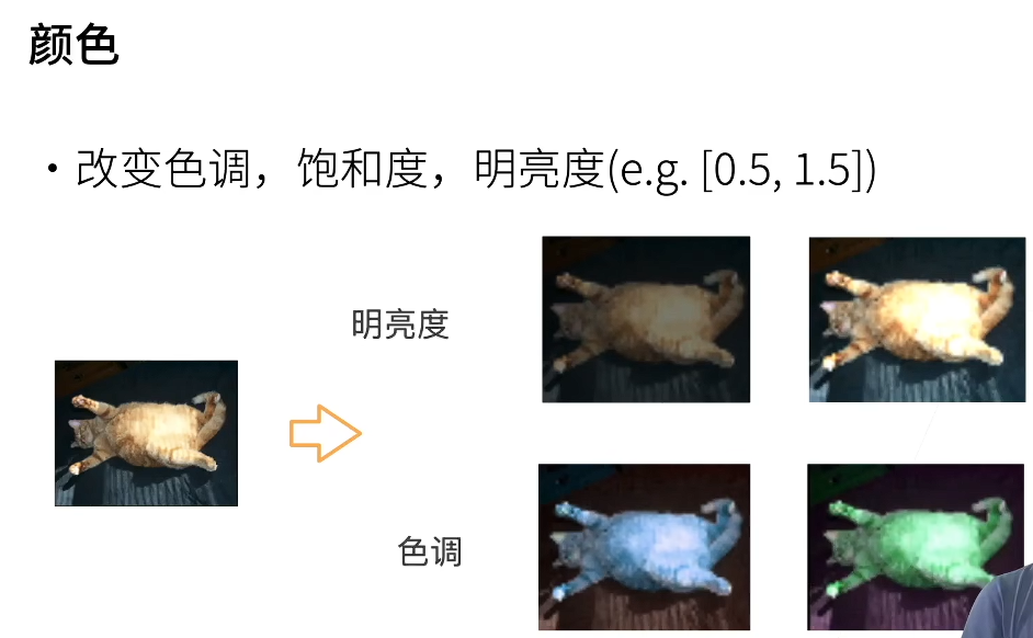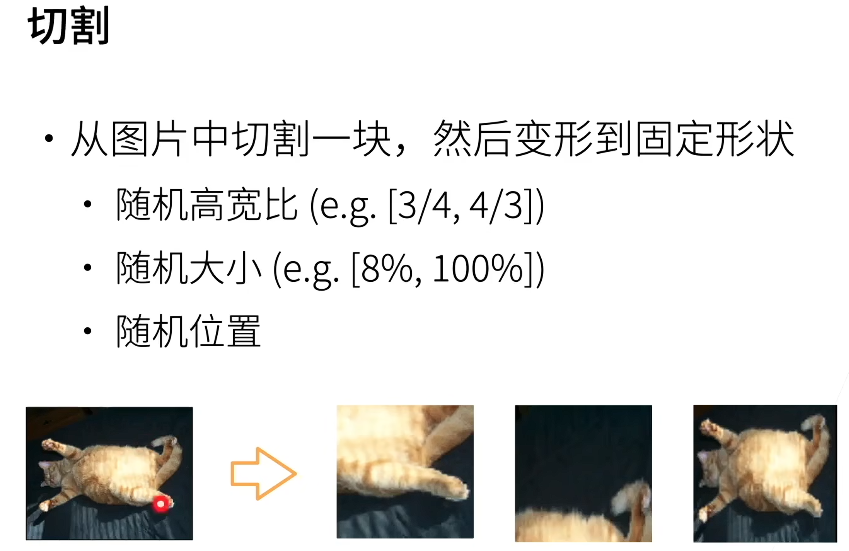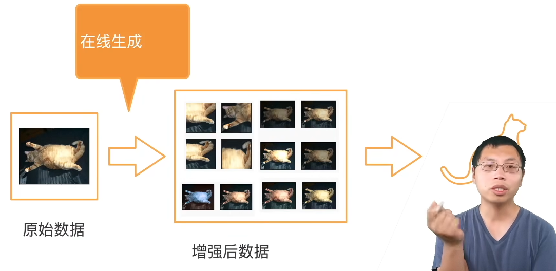 数据增广通过变形数据来获取多样性从而是的模型泛化性能更好,可以用在各种数据上,常见图片增广包括反转、切割、变色等。