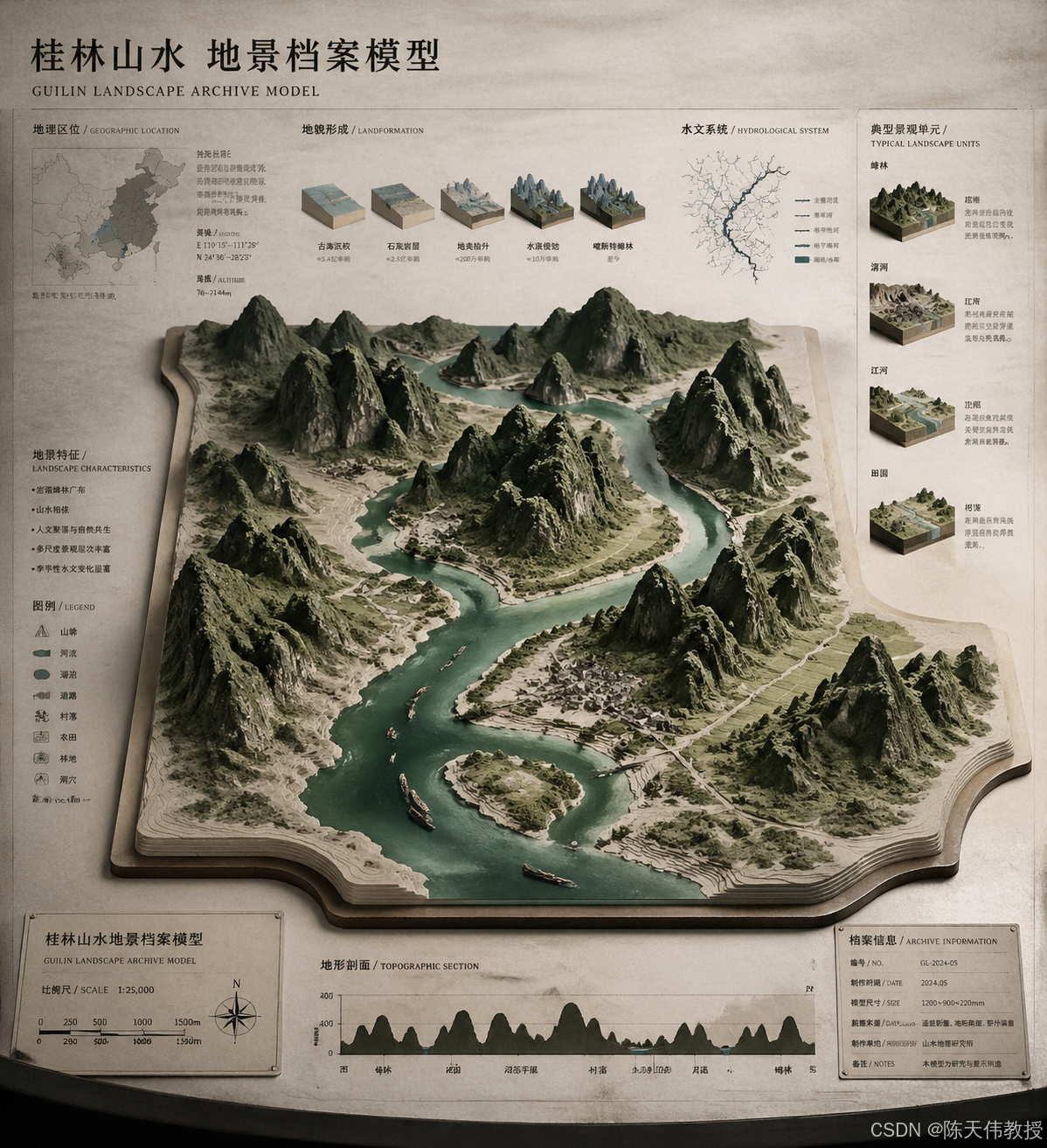 请根据桂林山水创作一张高完成度、高质感、适合系列化发布的「地景档案模型 / Landscape Archive Model」视觉图。 这不是普通地图,也不是普通风景插画或城市效果图,而是一张结合"二维地图图纸 + 三维立体区域模型 + 专业说明系统 + 博物馆展陈感"的高端档案式视觉图。画面需要像一件被真实制作出来的地理研究模型、城市规划沙盘、建筑提案模型或世界观设定展品,具有专业、克制、精密、可触摸的高级质感。