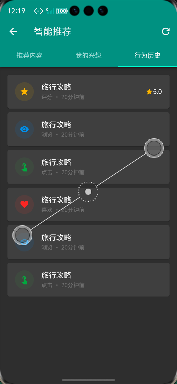 用户行为收集:全场景用户行为正常记录,持久化存储,应用重启后不丢失,时间衰减机制正常生效