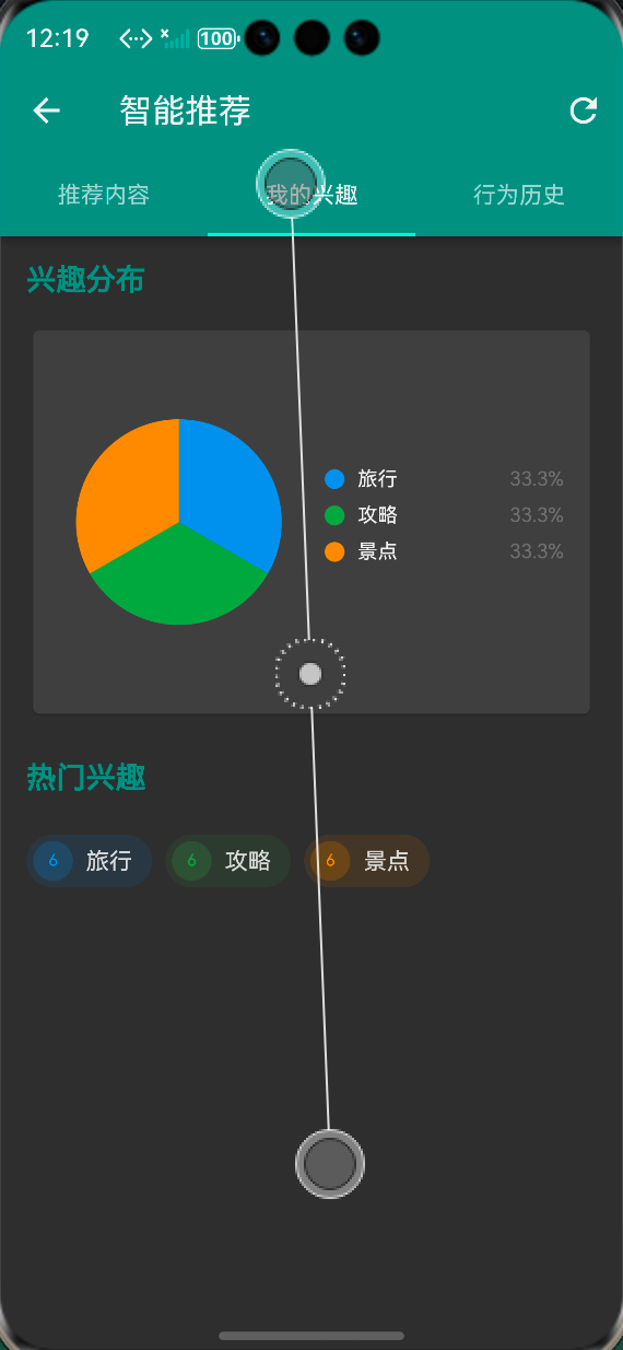 我的兴趣标签页:展示用户兴趣标签、兴趣分布饼图、热门兴趣排行