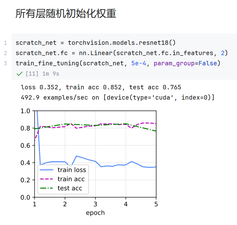 // 输出:从左图可以看出,微调模型在一开始就达到很高的准确率。而从头训练的模型到第5轮迭代其精度反而下降,出现了过拟合现象,且最终准确率远低于微调模型。
