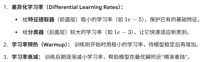此外,在训练阶段,就认为这是一个目标数据集上的正常训练任务。但由于针对性更强,故使用更强的正则化,且本身这个模型不会太差(或许可能已经具有不错的表现),因此我们对它的学习控制不要太大------更小的学习率+更少的数据迭代。(如果在微调时学习率过大或训练过久,模型可能会忘掉预训练时掌握的通用能力)