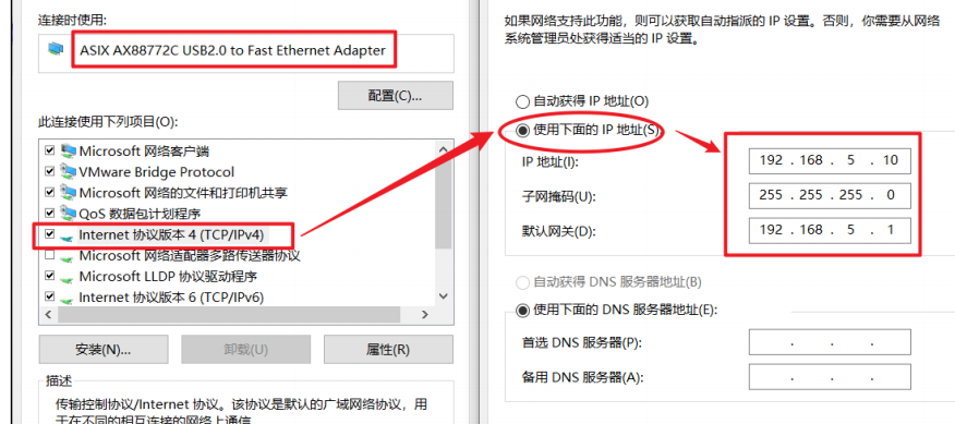 3、配置USB有线网卡为固定连接到windows系统,并且设置其IP