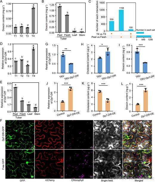 (A、B) 多花薯蓣块茎不同发育时期 (A) 与不同组织 (B) 的薯蓣皂苷含量。T1~T4 代表四个快速生长阶段(种植后 150、170、190、210 天)。数据为三次生物学重复的平均值 ± 标准差(n=3)。单因素方差分析(ANOVA)结果显示,不同小写字母代表组间差异显著(P<0.05)。(C) 不同比较组合的差异表达基因数量。UpSet 图横坐标为各组鉴定到的差异表达基因总数,纵坐标为各特有基因集的差异基因数量。(D、E) 实时荧光定量 PCR(RT-qPCR)检测多花薯蓣块茎不同发育时期 (D) 及不同组织 (E) 中Dp7-DR 的相对表达量。特异性引物序列见附表 2;以ACTIN 作为内参基因。各样品设置三次生物学重复,采用2−ΔΔCt法定量基因转录水平。(F) Dp7-DR 在本氏烟草叶片中的亚细胞定位。利用德国蔡司 LSM 880 激光共聚焦显微镜,分别采集表达 Dp7-DR-GFP 融合蛋白(上图)与空载 GFP(下图)的叶片共聚焦图像,参数设置:绿色荧光蛋白 GFP 激发波长 488 nm、内质网标记蛋白 SPER-mCherry 激发波长 561 nm、叶绿素自发荧光激发波长 640 nm。GFP:绿色荧光蛋白;SPER-mCherry:内质网定位标记;Chlorophyll:叶绿素自发荧光;Merged:GFP 荧光、内质网荧光、叶绿素自发荧光与明场图像叠加。比例尺:20 μm。(G--L) 多花薯蓣珠芽中Dp7-DR 基因沉默(G--I)与过表达(J--L)处理下,Dp7-DR 相对表达量(G、J)、胆固醇含量(H、K)及薯蓣皂苷含量(I、L)。数据为三次重复平均值 ± 标准差(n=3)。TRV:pTRV1 载体与空载体 pTRV2 共侵染;TRV-Dp7-DR :pTRV1 与重组载体 pTRV2-Dp7-DR 共侵染。∗P<0.05;∗∗P<0.01;∗∗∗P<0.001(t 检验)。