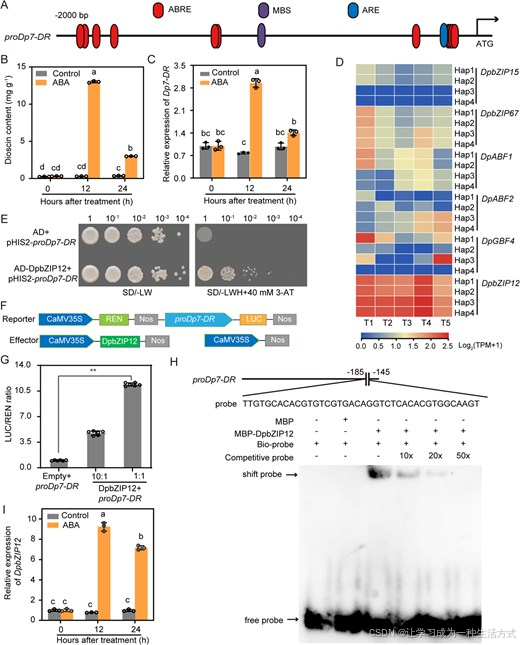(A) 利用 PlantCARE 数据库对Dp7-DR 基因启动子顺式作用元件进行预测。(B、C) 100 μmol/L 脱落酸(ABA)处理下的薯蓣皂苷含量 (B) 与Dp7-DR 相对表达量 (C)。数据为 3 组独立生物学重复的平均值 ± 标准差;不同小写字母表示经单因素方差分析(ANOVA)检验差异显著(P<0.05)。(D) A 亚家族 bZIP 转录因子编码基因在 4 个块茎发育时期(T1--T4)、4 套单倍型中的表达热图。(E) 酵母单杂交试验验证 DpbZIP12 与Dp7-DR 启动子的结合。将 pHIS2-proDp7-DR 与 AD-DpbZIP12 质粒共转化 Y1H Gold 酵母菌株。AD:GAL4 激活域;SD/−LW:缺失亮氨酸、色氨酸的合成缺陷培养基;SD/−LWH:缺失亮氨酸、色氨酸、组氨酸的合成缺陷培养基;3-AT:3 - 氨基 - 1,2,4 - 三唑。(F) 双荧光素酶报告实验载体构建示意图。将Dp7-DR 启动子克隆至 pGreenII-0800-LUC 载体的萤火虫荧光素酶(LUC)报告基因上游;DpbZIP12 克隆至 pGreenII-62-SK 载体,作为效应载体。(G) 双荧光素酶实验证明 DpbZIP12 可激活Dp7-DR 启动子的转录活性。以空载体 pGreenII-62-SK 为阴性对照;含 pGreenII-62-SK-DpbZIP12 与 pGreenII-0800-LUC-proDp7-DR 的农杆菌菌液分别按 10:1、1:1 体积比混合侵染。数据为平均值 ± 标准差(n=6);对照组与 1:1 混合组采用 t 检验进行差异分析,P<0.01 。(H) 凝胶迁移实验(EMSA)验证纯化重组蛋白 MBP-DpbZIP12 与 Dp7-DR 启动子的结合能力。生物素标记探针与 MBP-DpbZIP12 蛋白共孵育,非标记探针用作竞争探针。MBP:麦芽糖结合蛋白;pro Dp7-DR : Dp7-DR 启动子。(I) 100 μmol/L ABA 处理下 DpbZIP12 的相对表达量。数据为 3 组独立重复平均值 ± 标准差;* P<0.05 、 P<0.01、***P<0.001(t 检验)。