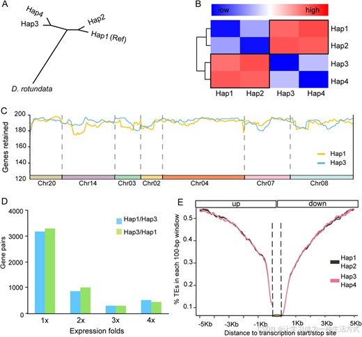 (A) 基于 4 937 003 条染色体特异性 SNP 聚类分析,将基因组稳定划分为两大分支。以圆叶山药(Dioscorea rotundata )为外类群,Hap1~Hap4 代表分型完成后的四套染色体。以 01 号染色体为代表性示例,其余多数染色体均呈现一致进化规律。(B) 亚基因组间序列变异热图。每个色块代表两个亚基因组之间的 SNP 密度与插入缺失(InDel)差异关系,颜色深浅反映变异程度高低。(C) 山药两个亚基因组代表性染色体的基因密度差异。展示两套亚基因组代表性染色体上连续区段的基因密度分布,无明显大片段断裂;基因密度采用 200 kb 滑动窗口计算。(D) 山药两个亚基因组旁系同源基因对的优势表达基因数量统计。蓝色:Hap1 基因表达量高于 Hap3 同源基因(表达倍数>1、2、3、4 倍);绿色:Hap3 基因表达量高于 Hap1 同源基因(表达倍数>1、2、3、4 倍)。(E) 不同基因集上下游侧翼区域的转座元件(TE)分布。以转录起始位点上下游各 5 kb 范围为研究区间,采用 100 bp 滑动窗口计算 TE 密度;黄色椭圆标注基因本体区域。