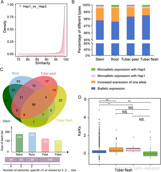 (A) 两个单倍型(Hap1 与 Hap3)等位基因编码序列差异比较。(B) 茎、根、块茎外皮与块茎肉质组织中的等位基因特异性表达(ASE)模式。Hap1 与 Hap3 等位基因 TPM 均>2、且表达差异小于 2 倍,定义为双等位均衡表达 ;双等位基因 TPM 均>2、但表达差异大于 2 倍,定义为单等位基因优势上调表达 ;仅其中一个单倍型等位基因 TPM>2、另一等位基因 TPM≤2,分别定义为 Hap1 优势表达 或 Hap3 优势表达 。(C) 四种组织中等位基因特异性表达基因的韦恩交集分析。(D) 块茎肉质组织中不同类型等位特异性表达基因的 Ka/Ks 比值分布;圆点代表离群值,箱体表示四分位距。*P ≤ 0.05;**P ≤ 0.001(t 检验)。