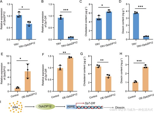 (A--H) DpbZIP12 (A、E)与Dp7-DR (B、F)的相对表达量、胆固醇含量(C、G)及薯蓣皂苷含量(D、H);其中 A--D 为DpbZIP12 基因沉默材料,E--H 为DpbZIP12 过表达材料。采用附表 2 所列引物进行实时荧光定量 PCR 检测,以ACTIN 为内参基因。所有样品设置三组生物学重复,通过2−ΔΔCt法定量基因转录水平。数据为三次重复的平均值 ± 标准差(n=3);∗P<0.05、∗∗P<0.01、∗∗∗P<0.001(t 检验)。TRV:pTRV1 与空载体 pTRV2 共侵染,作为阴性对照;TRVDpbZIP12 :pTRV1 与重组载体 pTRV2DpbZIP12 共侵染。(I) ABA 介导调控薯蓣皂苷生物合成的作用模型:DpbZIP12 通过激活Dp7-DR 的转录,正向调控薯蓣皂苷合成。