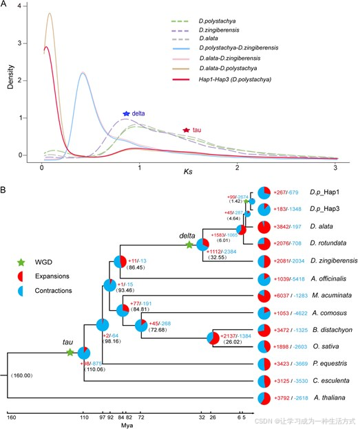 (A) 同义替换率(Ks)分析表明,多花薯蓣在演化过程中发生了一次近期、物种特异性的全基因组复制事件。(B) 多花薯蓣与其他 11 种植物的系统发育树。饼图展示了基因家族整体变化中扩张与收缩的基因家族占比;各分支节点标注了估算的分化时间(百万年前,Mya);五角星代表三次全基因组复制事件。