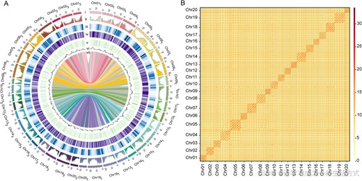 (A) 山药基因组全景图谱。由外至内依次展示:(i) 染色体分布、(ii) 基因密度、(iii) 转座元件密度、(iv) 基因表达量、(v) 非编码 RNA 含量、(vi) GC 含量、(vii) 不同染色体间旁系同源基因分布;采用 500 kb 滑动窗口 分析。(B) 全基因组 Hi-C 互作热图,展示各染色体对应的 4 套单倍型(Hap1、Hap2、Hap3、Hap4)。