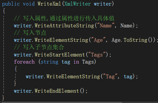foreach (KeyValuePair<TKey, TValue> item in this){ 遍历语句块 }接下来,我们通过写入器writer对键值进行写入,其中每一个键值对的键和值都会被item节点包裹(方便区分各键值对)该部分是遍历语句块中的内容