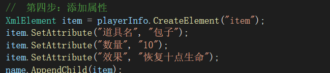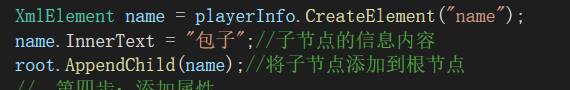 XmlDocument实例.AppendChild(根节点实例)- 添加子节点(playerInfo为XmlDocument实例,root为根节点实例)