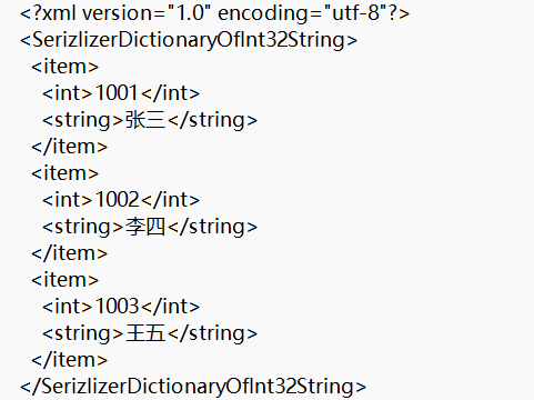 XmlSerializer valueSer = new XmlSerializer(typeof(TValue))其次,我们遍历字典得到他的键值对item