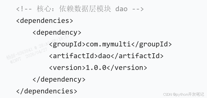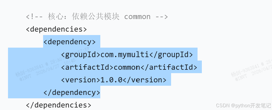 模块间在 pom.xml 声明依赖 = 告诉 Maven:我这个模块,要使用另一个模块的代码!
