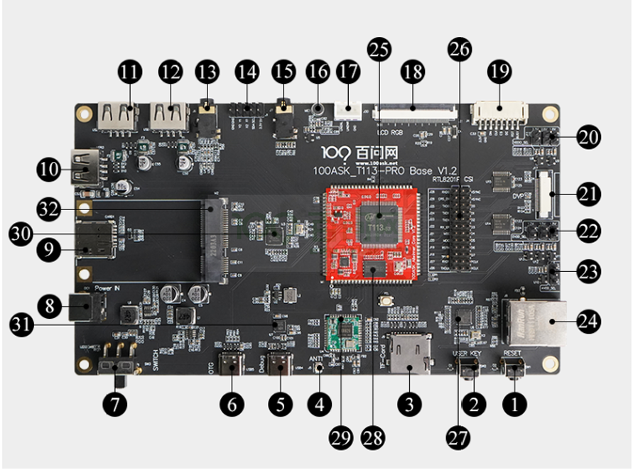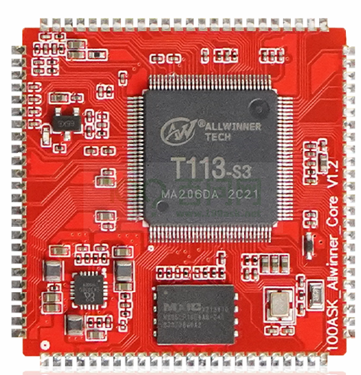 100ASK_T113-Pro 采用核心板 + 底板组合设计。核心板集成了主芯片、电源、板载 Flash(SPI NAND),底板则引出几乎所有可用 IO,方便评估与学习。