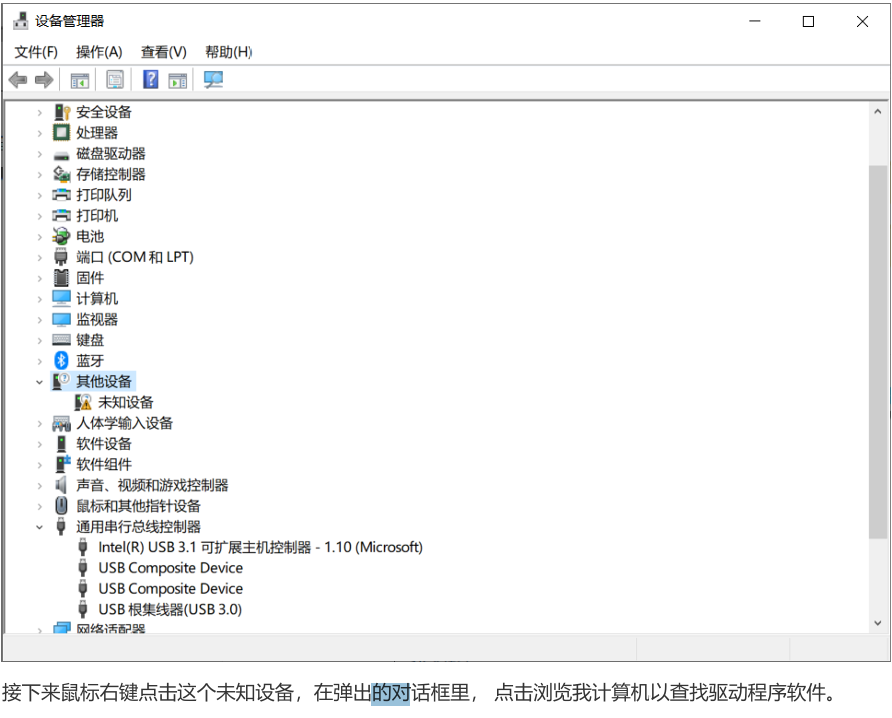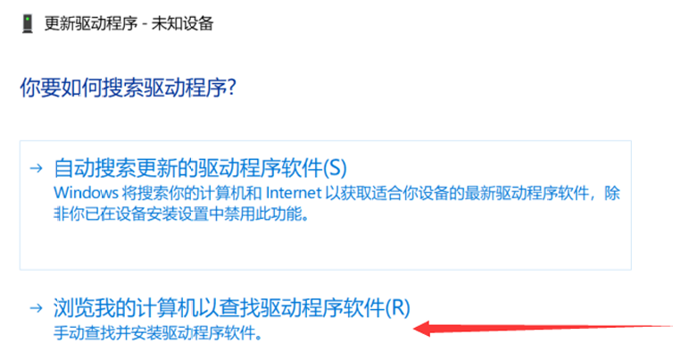 右键未知设备 → 更新驱动程序 → 浏览我的电脑。