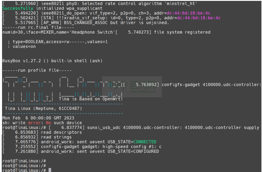重启后打开串口终端,应该能看到完整的启动日志,最后进入 root@TinaLinux:/#。