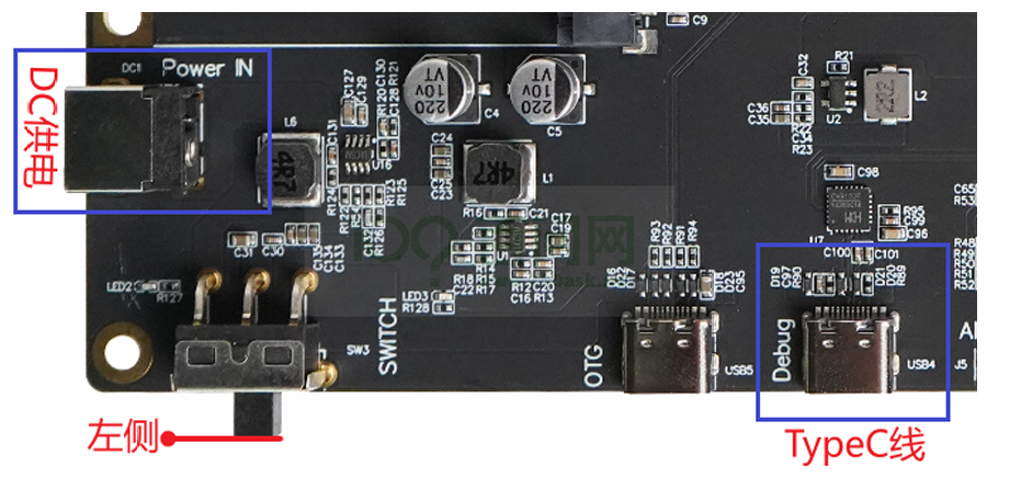 如果不想用 DC,也可以只用 OTG 供电(开关拨右),但串口调试仍需接 Debug 线。