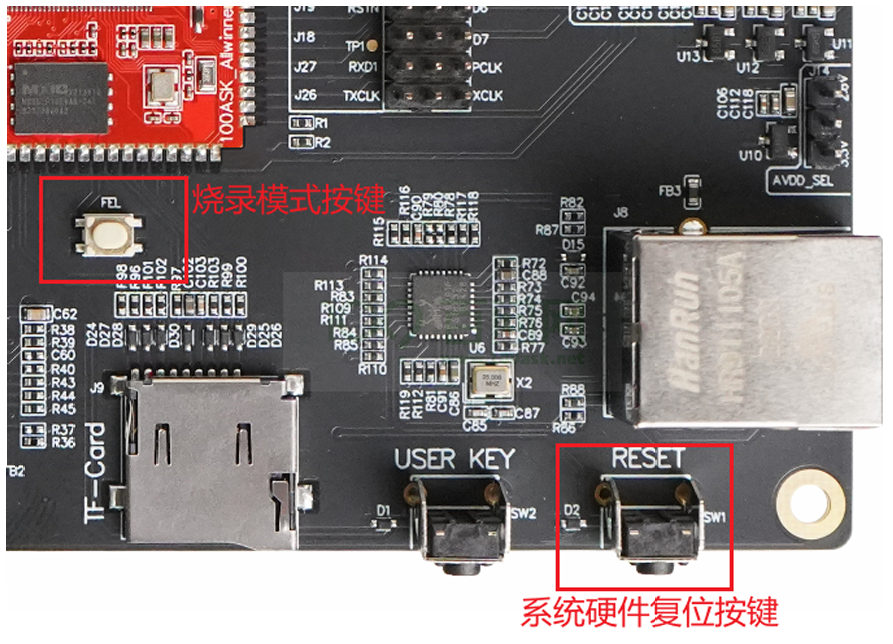 上图中标记的 FEL 按键 和 烧录模式按键 是同一个白色按钮,配合 RESET 进入烧录模式。