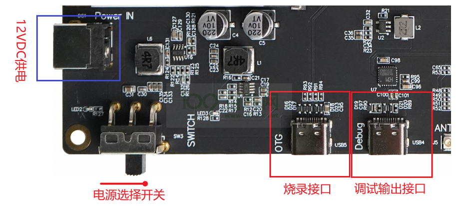 - 使用 12V DC 适配器 接入 DC 接口(红框内),电源开关拨到 左侧。