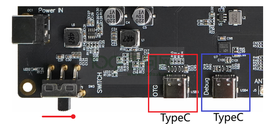 - 用另一根 Type-C 线连接开发板的 OTG 接口(图中红框)到电脑 USB 口。