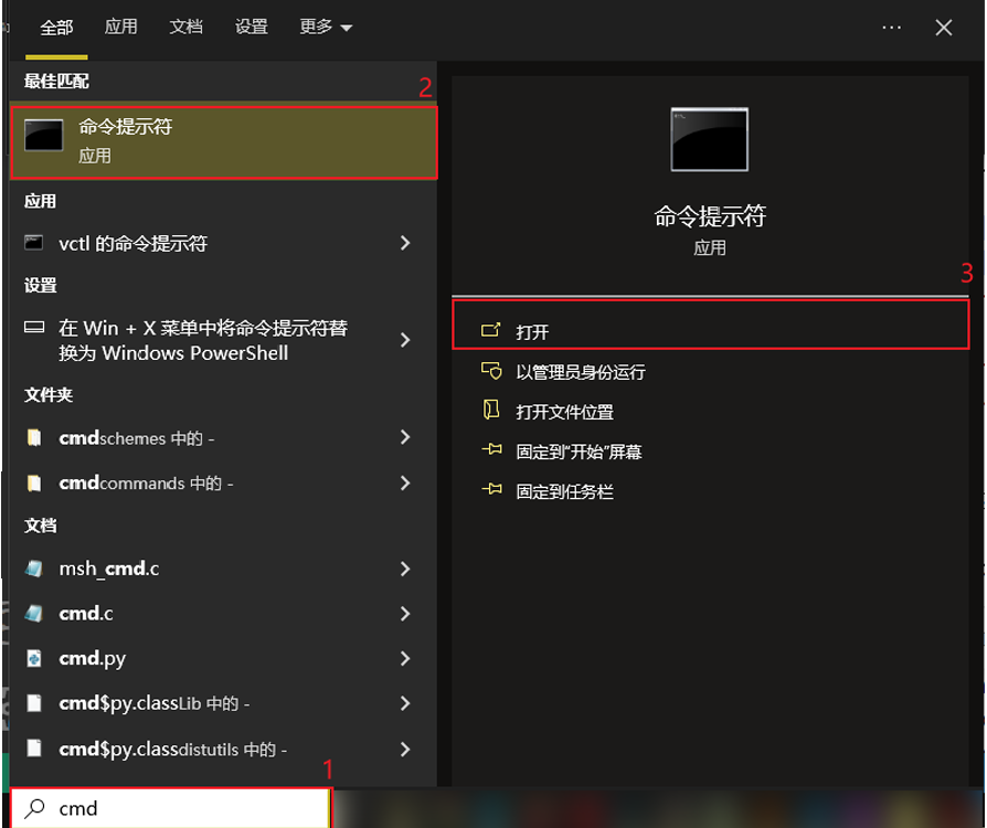 方式1:直接在Windows10/11搜索对话框中输入 cmd 在弹出的软件中点击 命令提示符