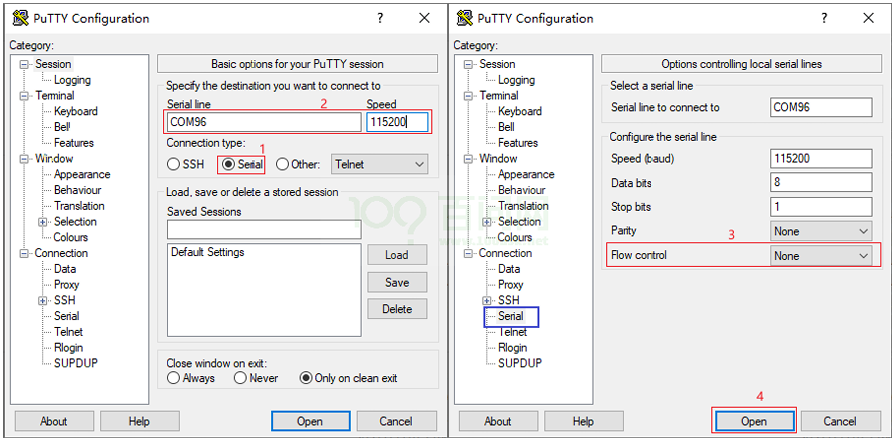 115200。 - 左侧点击 Serial ,将 Flow control 设为 None。