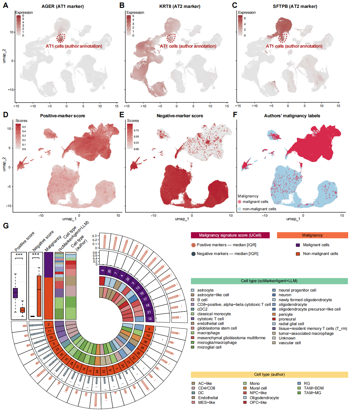 scMarkerAgent 包含 417,812 条疾病相关背景下的细胞类型-标志物注释。以胶质母细胞瘤为例,作者从 scMarkerAgent 中检索了胶质母细胞瘤特异性的正向和负向标志物集,并使用 UCell 计算每个细胞的特征评分。恶性细胞中的正向标志物评分普遍较高(Fig. 5D),并且与作者最初使用 SCEVAN iCNV 分析分配的恶性标签大致一致(Fig. 5F),而负向标志物评分则呈现相反趋势(Fig. 5E)。总之,这些互补信号表明,负向标志物可以作为排除约束,并提高恶性细胞识别的稳健性,其效果优于单独使用正向标志物(Fig. 5G)。