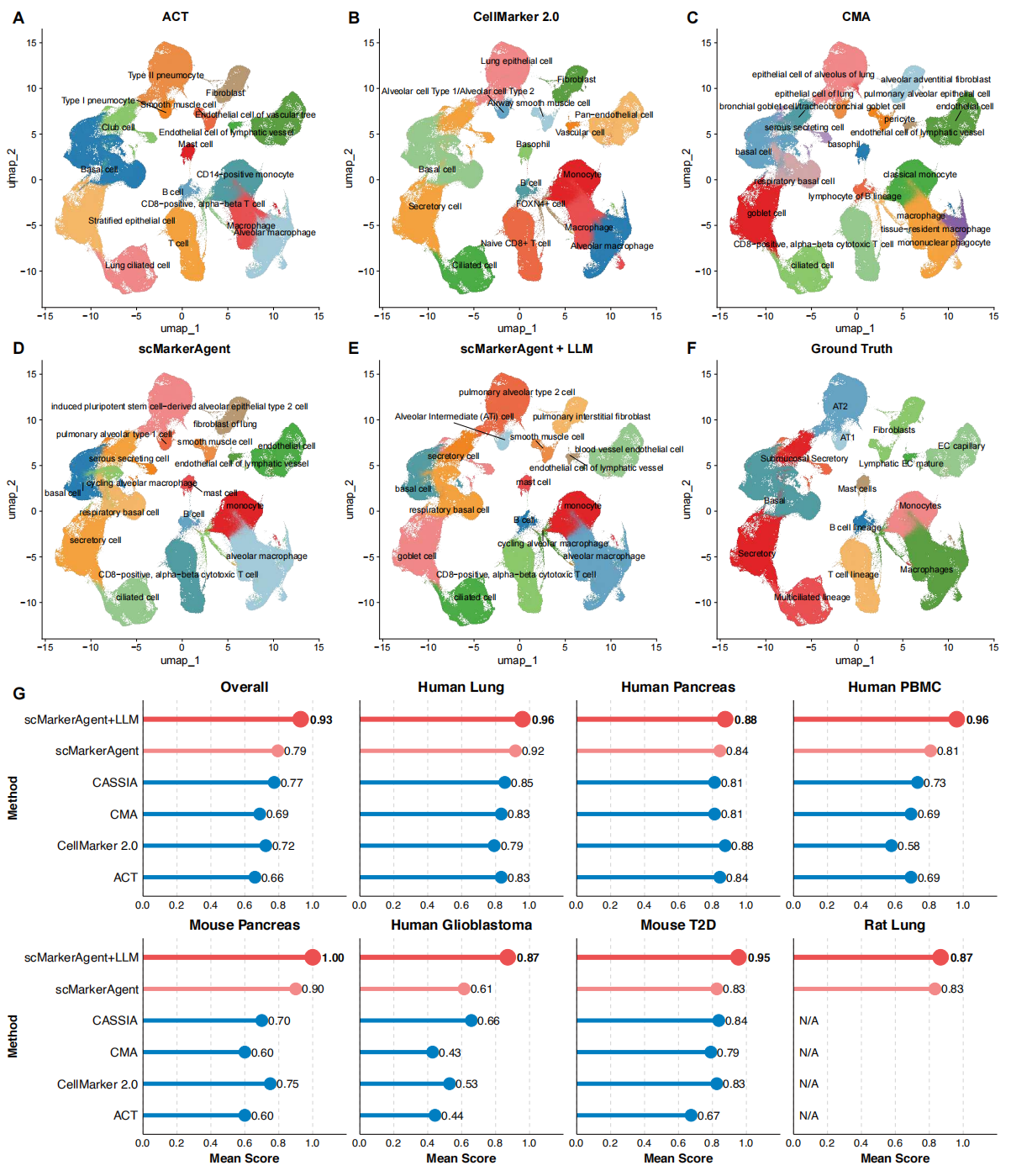 Figure 4. 细胞注释智能体(ScType+scMarkerAgent+LLM)在真实场景细胞类型注释中的表现及其与同类标志物或注释资源的比较